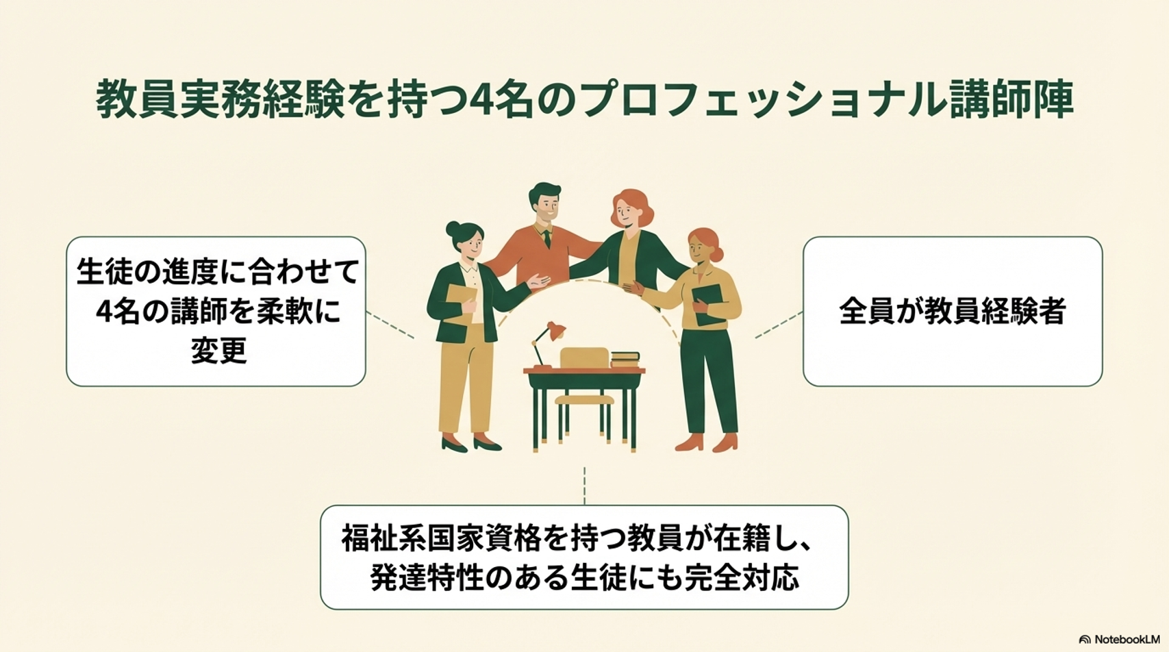 教員実務経験のある4人の講師が、社会福祉の理念の元で協力してアットホームな環境を整え、一人ひとりの個性・理解度に合わせた個別対応指導を行い、生徒の自発的な学力と自信を育てます。