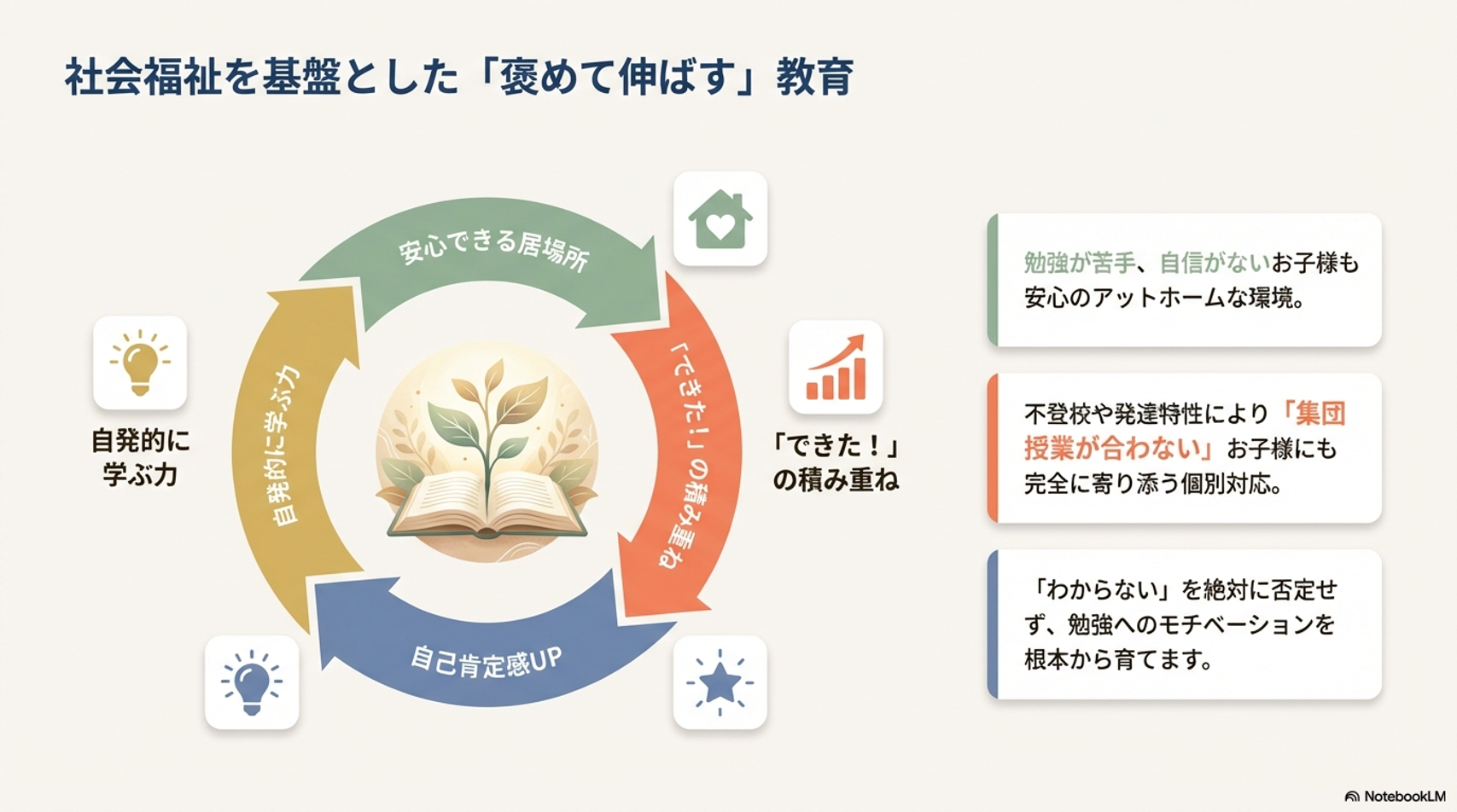 勉強が苦手なお子さま、自信をなくしているお子さま、不登校や発達特性により集団授業が合わないお子さまでも、安心して学べるアットホームな雰囲気を大切にしています。