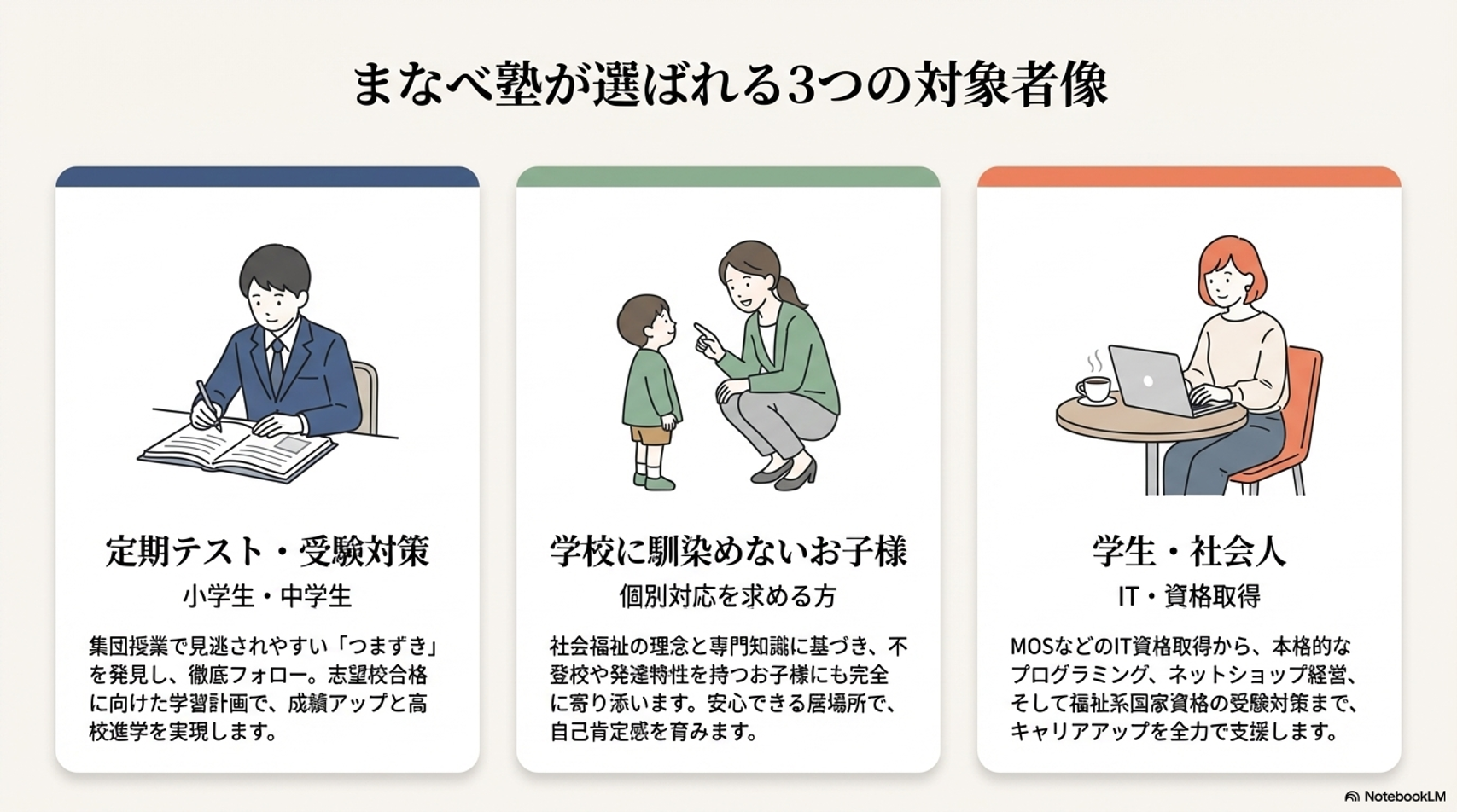 生徒一人ひとりの「わかる」を支え、 自発的に学ぶ力を育てる学習塾です。