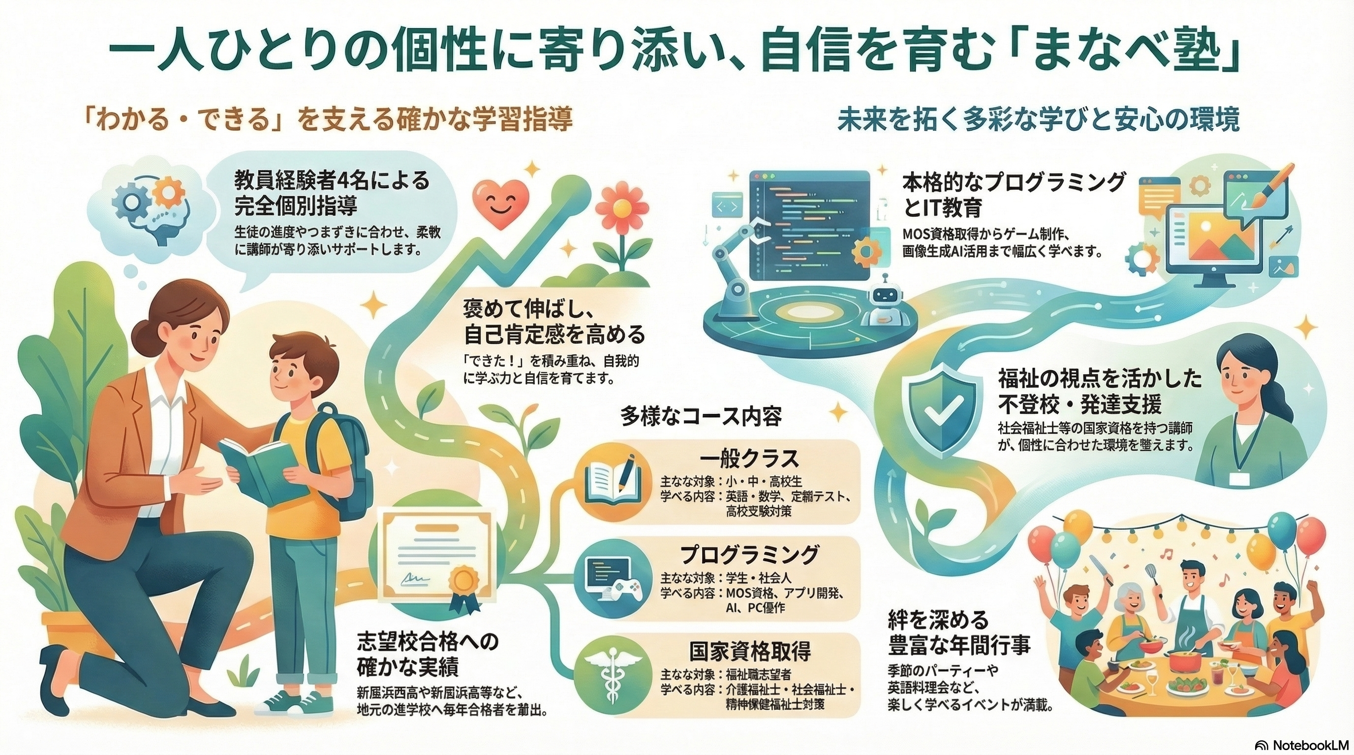 小学生・中学生の英語・数学指導を中心に、定期テスト対策、高校受験対策、学生・社会人向けプログラミング指導や福祉系国家資格試験対策にも対応しています。